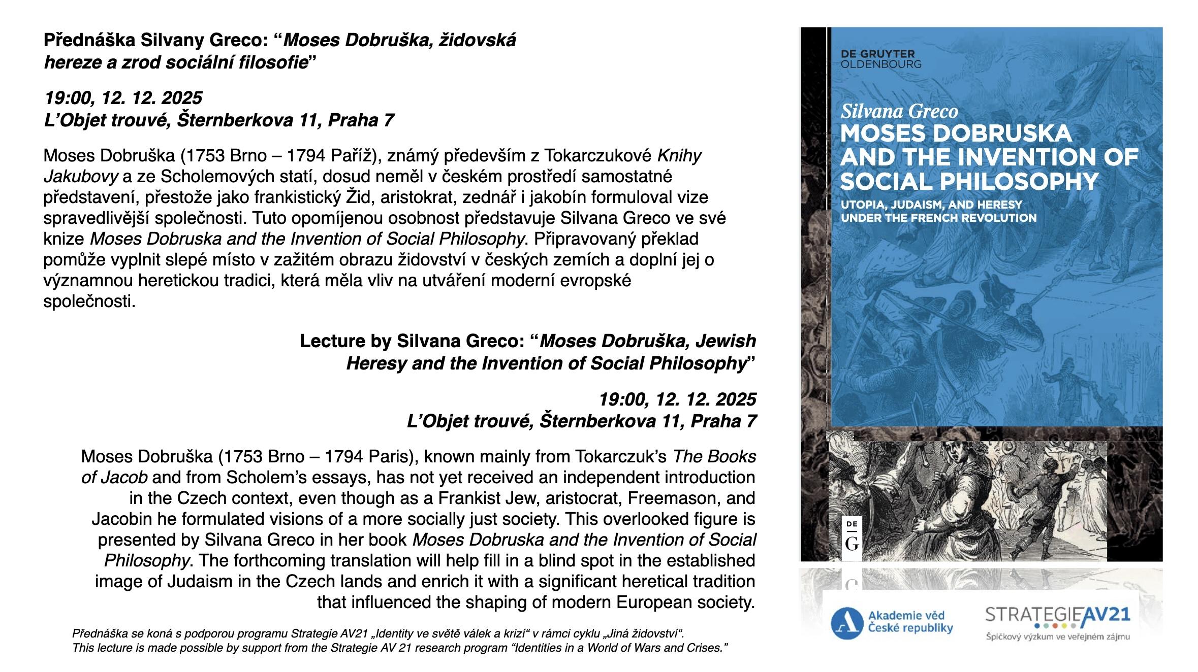 Moses Dobruska (1753 Brno - 1794 Paris), known mainly from Tokarczuk's The Books of Jacob and from Scholem's essays, has not yet received an independent introduction in the Czech context, even though as a Frankist Jew, aristocrat, Freemason, and Jacobin he formulated visions of a more socially just society. This overlooked figure is presented by Silvana Greco in her book Moses Dobruska and the Invention of Social Philosophy. The forthcoming translation will help fill in a blind spot in the established image of Judaism in the Czech lands and enrich it with a significant heretical tradition that influenced the shaping of modern European society.