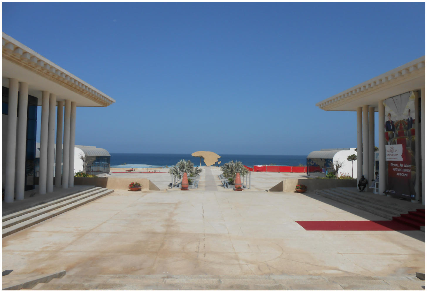 So eröffnet sich dem Besucher der DAK ́ART 2014 beim Begehen des Platzes zunächst der pompöse marokkanische und algerische Pavillon, die offiziell als Ausstellungsort im OFF-Programm der Biennale dienten und zu denen jeweils ein Katalog präsentiert wurde. Bereits die Architektur der beiden Pavillons, versetzt den Besucher ins staunen. So sind beide Pavillons baugleich in einem klassischem Konzept errichtet worden und erinnern an die Architektur der griechischen Tempel. Beide sind mit einem Säulenumgang gestaltet, wobei jede Seite drei Säulenpaare aufweist und eine Art Zahnschitt am Architrav des Gebäudes zu erkennen ist. Die Säulen selbst sind jedoch schmucklos und reduziert gehalten, wie auch der gläserne Kubus, der sich hinter den Säulen erstreckt. So zeigt sich hier wiederum eine moderne Architektur, wodurch ein Zusammenspiel von Vergangenheit und Gegenwart zu erkennen ist.