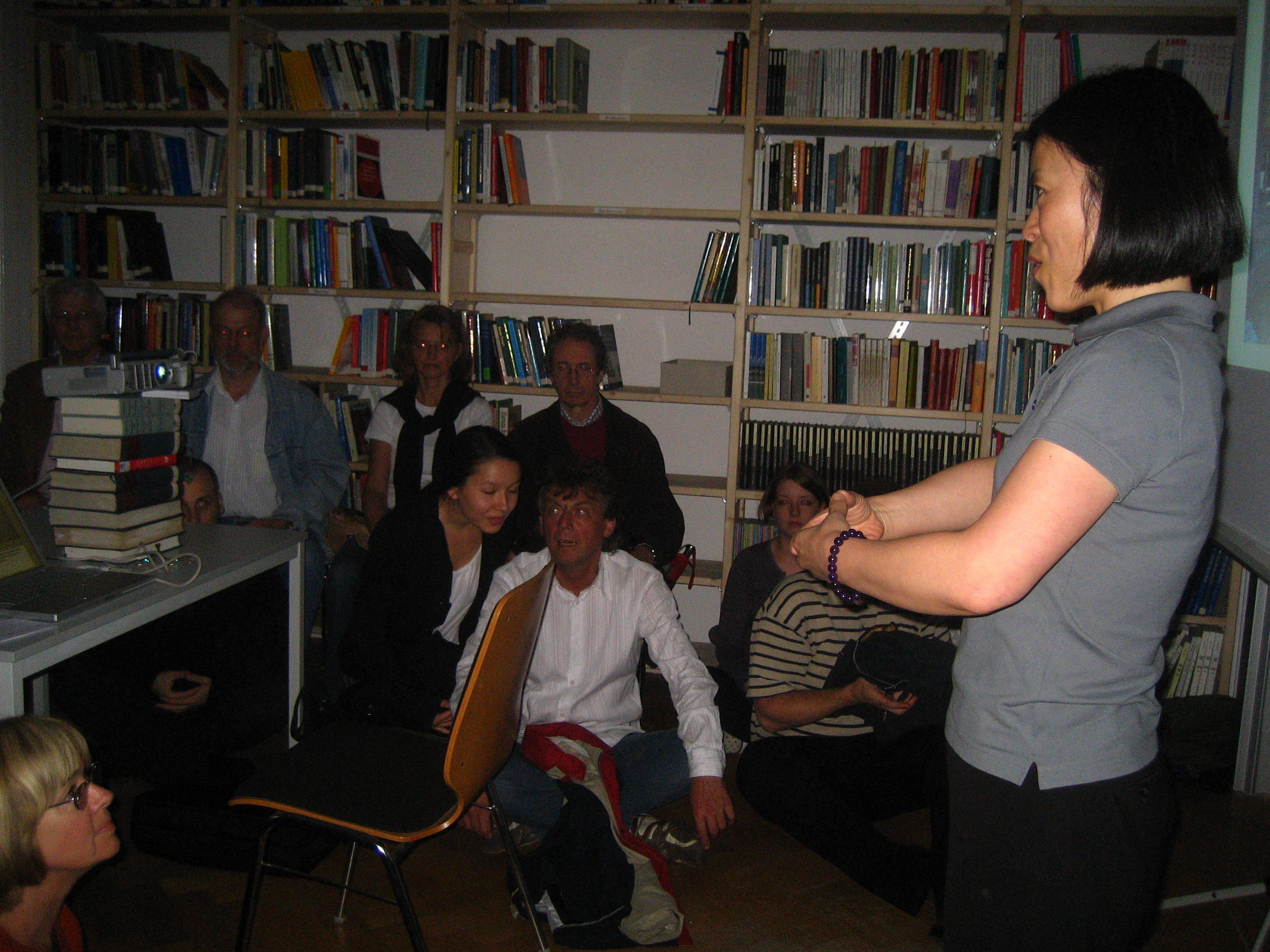 Neben den Workshops wurden ebenfalls Präsentationen und kurze einführende Vorlesungen veranstaltet. Um 19 Uhr berichtete Frau Chon Namhee, Sprachlehrbeauftragte des Instituts und Expertin für koreanischen Zen-Buddhismus, über diese meistens doch eher in Japan vermutete Religion und gab eine kurze Einführung in Meditationstechniken. Der kleine Raum der Institutsbibliothek war von Interessenten so überfüllt, dass viele aus Platz- und Stuhlmangel auf dem Boden sitzen mussten und auch meine Wenigkeit stand draußen vor der Bibliothek und beobachtete das Geschehen durch den Fensterrahmen. Dennoch gab es keine Beschwerden, denn das Interesse und die Qualität des Vortrags machten die genannten Umstände mehr als wieder wett.
