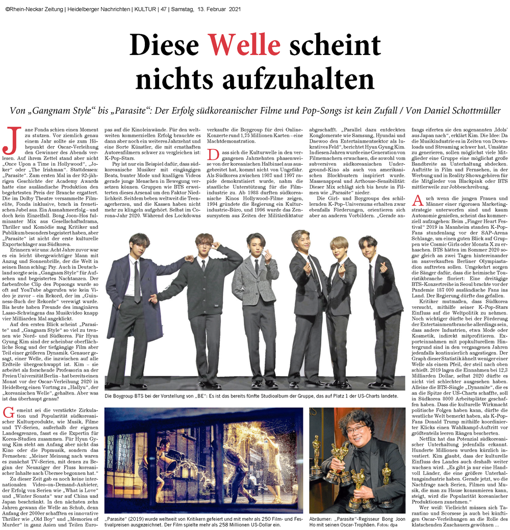 At 13 February, the Rhein-Neckar Zeitung offered an in-depth article on the massive popularity of Korean films, K-pop, and TV series out of Korea's border with the interview of Dr Hyun Gyung Kim, who specialized in feminist cultural studies focused on East Asian region.
