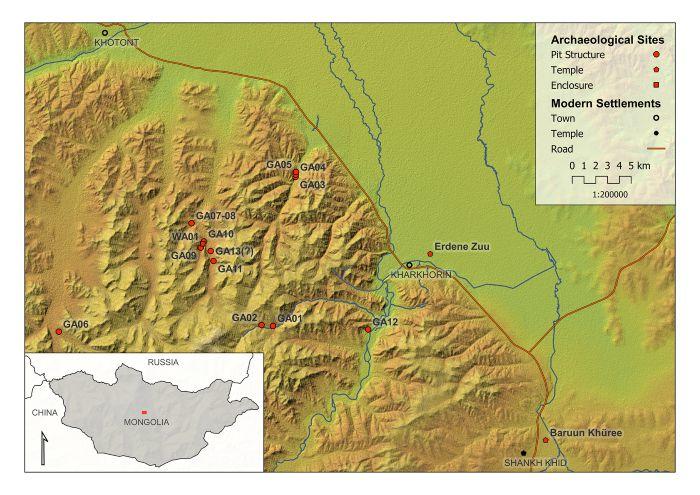 Fig. 2: Map of study region in Central Mongolia, highlighting the investigated complexes GA-9, GA-10, WA-1, further pit structures (“Grubenanlagen”), and Baruun Khüree monastery (map base: Google Earth).