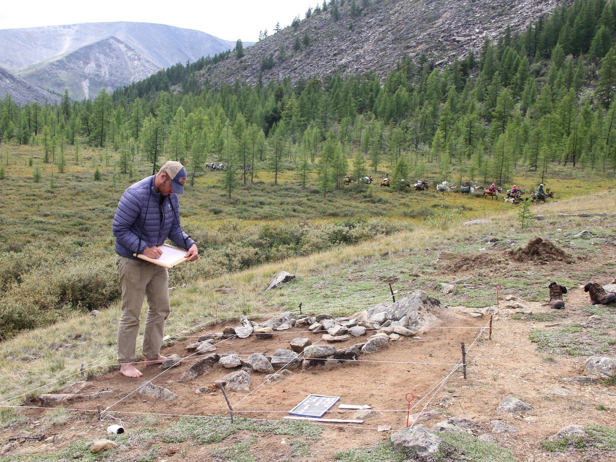 William Taylor dokumentiert eine prähistorische Struktur, während im Hintergrund eine Rentier-Karavane vorbeizieht, Sommer 2024.