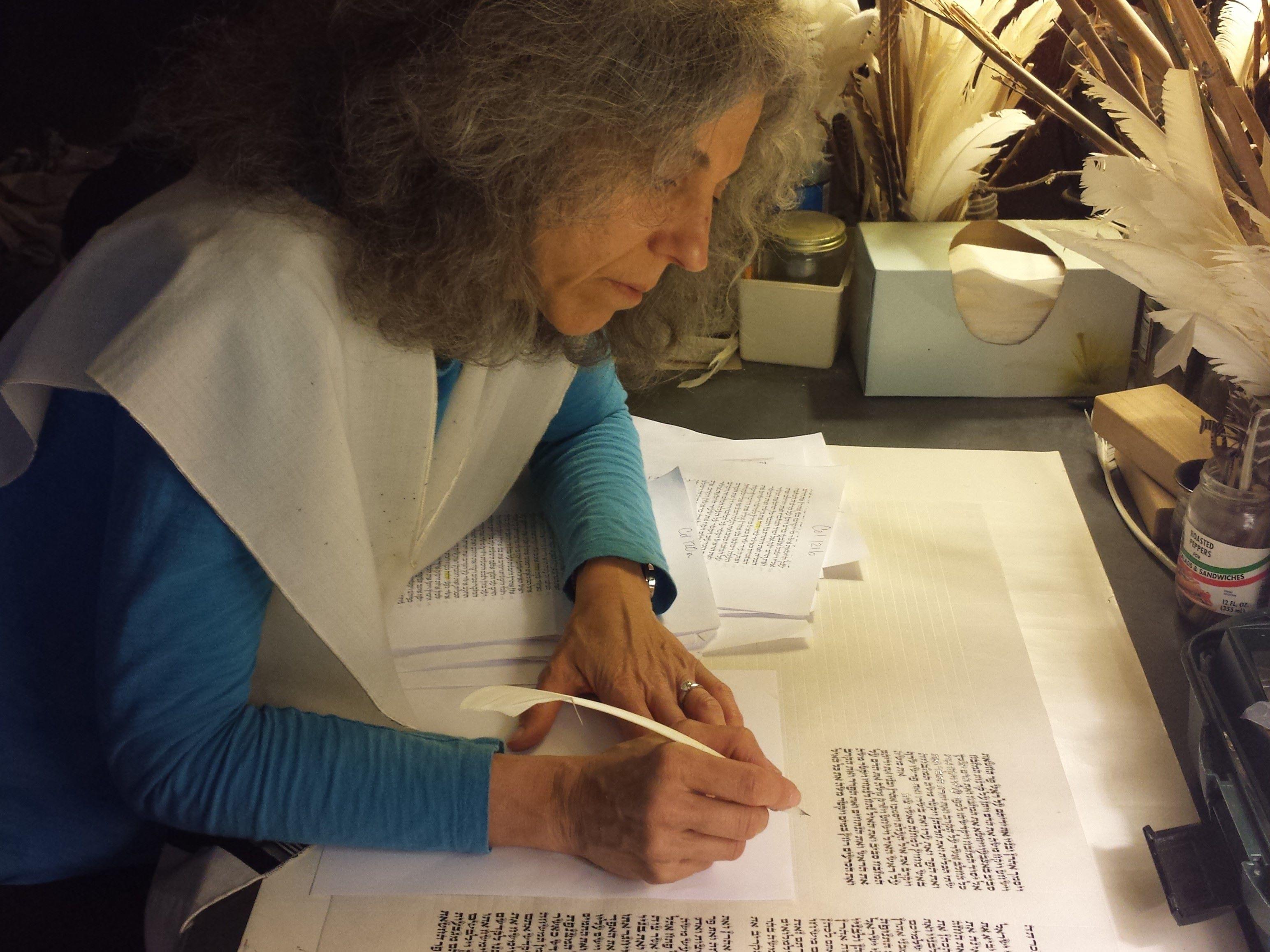 Schreiberin Linda Motzkin beim Schreiben einer Torarolle.